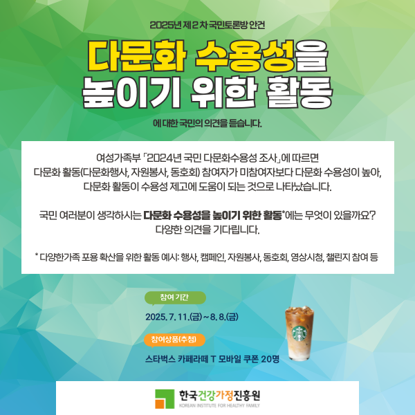 다문화 수용성을 높이기 위한 활동에 대한 국민 의견을 듣습니다(커피 쿠폰 20명 추첨)